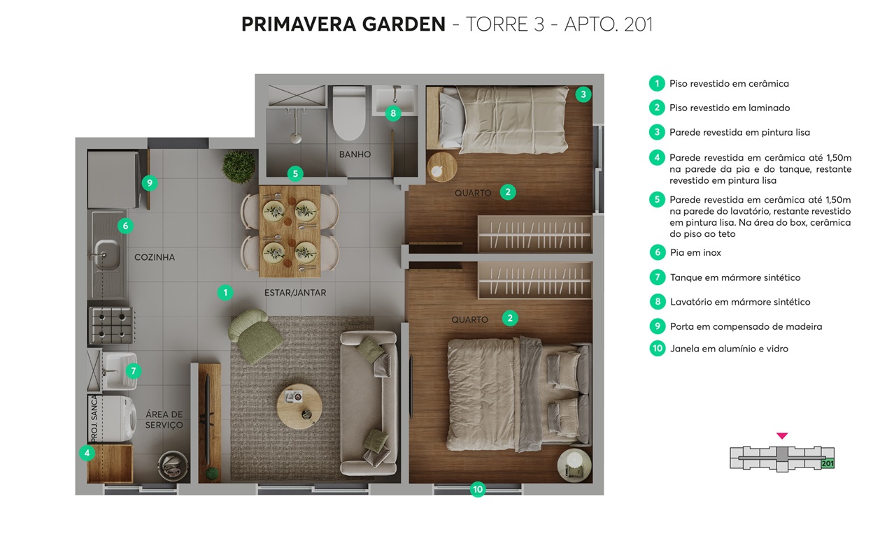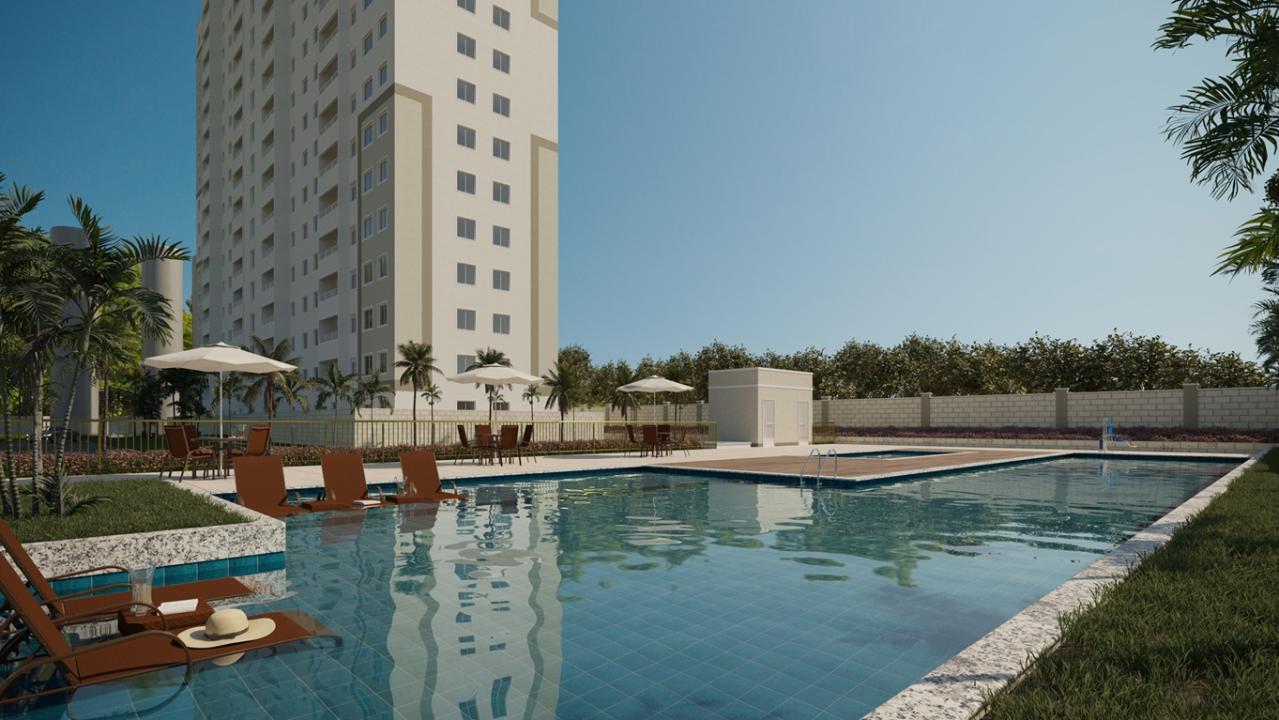 Apês de 2 quartos com opções de varanda e de área privativa, lazer completo com piscinas adulto e infantil, playground, salão de festas, espaço gourmet, churrasqueira, academia coberta, espaço funcional, redário e quadra de areia descoberta.