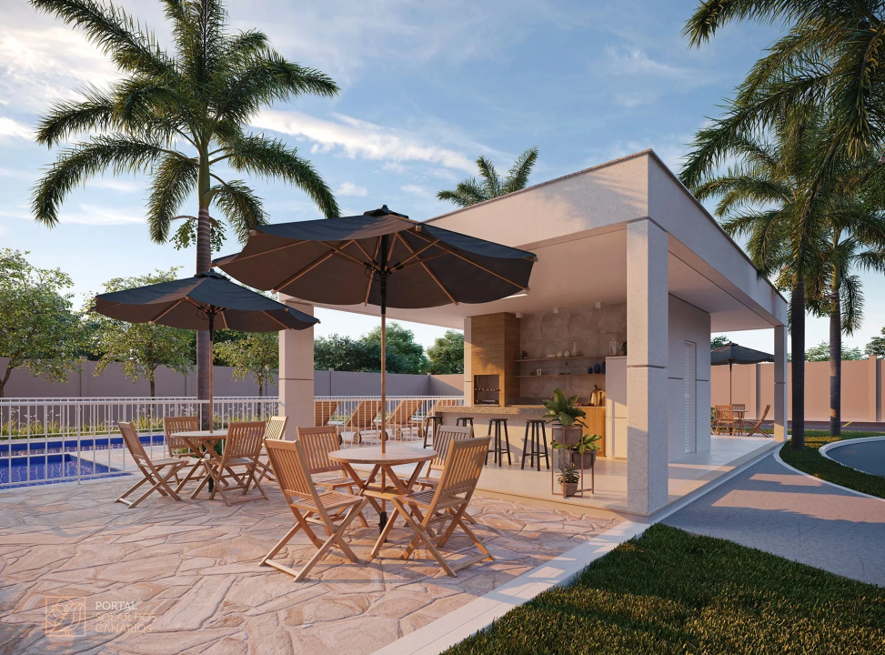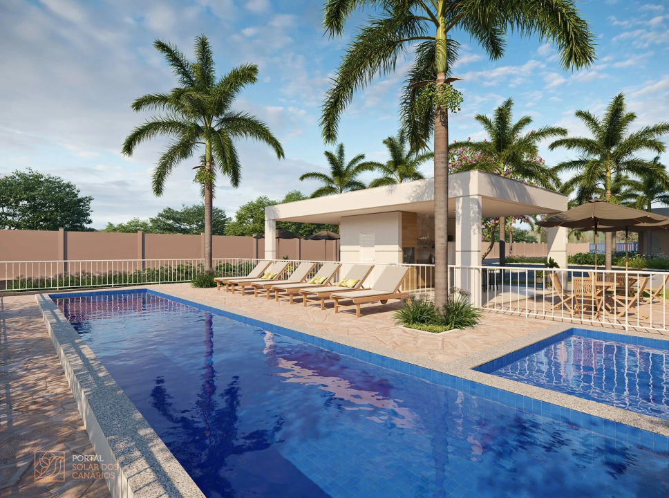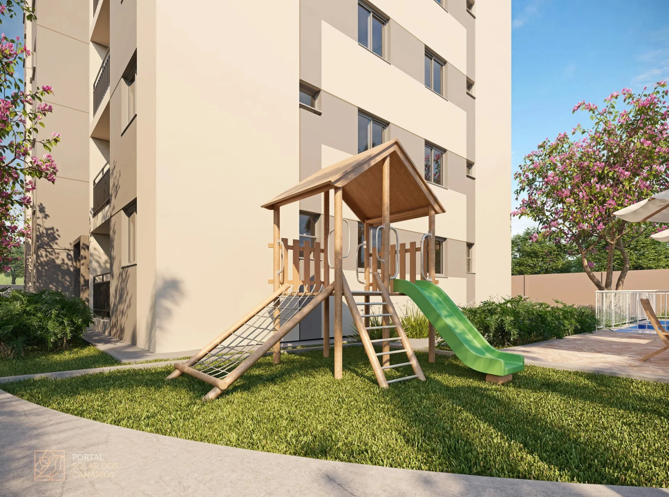 Playground, praça de convívio, piscinas adulto e infantil, solário, churrasqueira e salão de festas